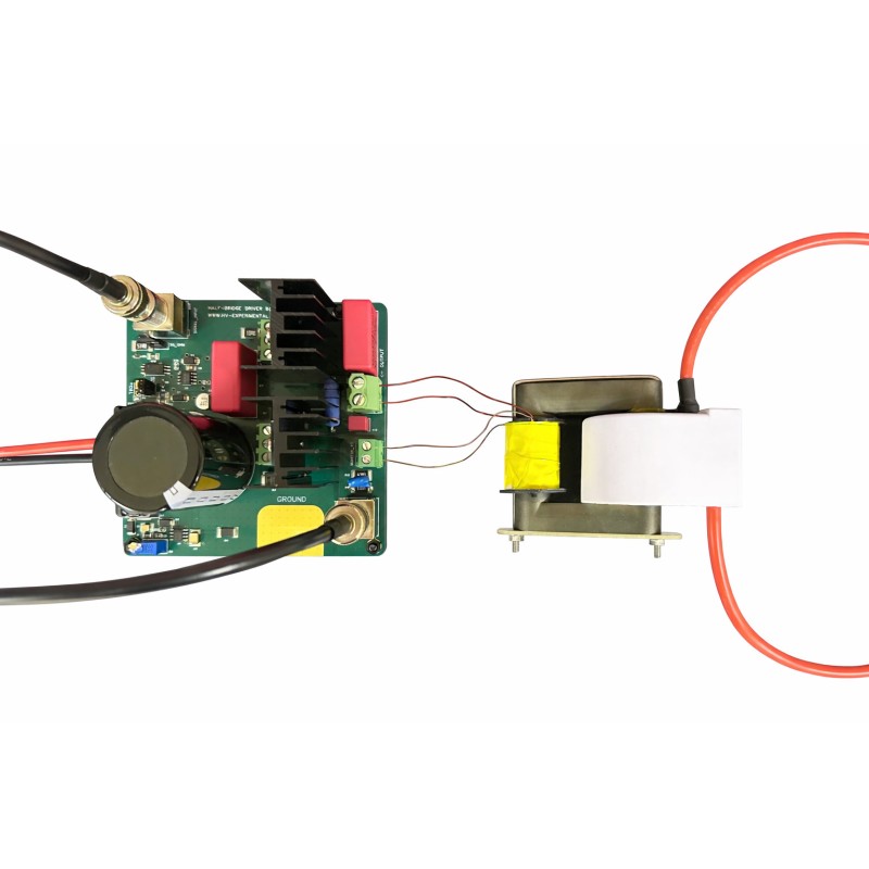 Our enhanced Half-Bridge Amplifier is a powerhouse in the realm of high-voltage experimentation, capable of handling input voltages up to 350V, both DC and AC, and sustaining a continuous current of 5 amperes. When paired with one of our AC or DC flyback transformers, it can achieve voltage levels up towards 30kV, offering unprecedented control over frequency and current. It's an ideal choice for advanced applications requiring higher power levels:
