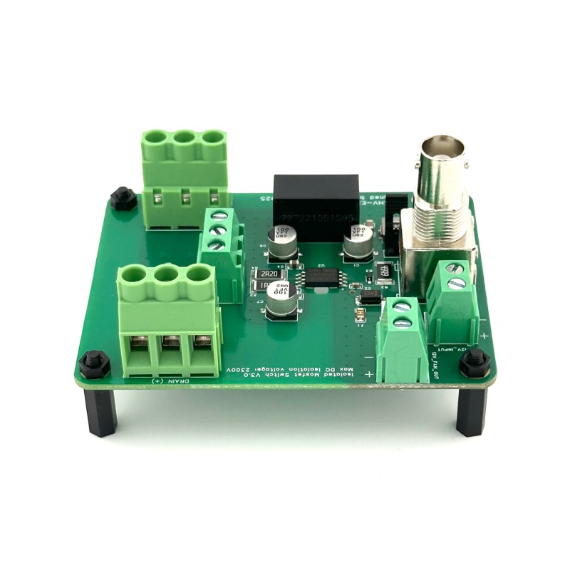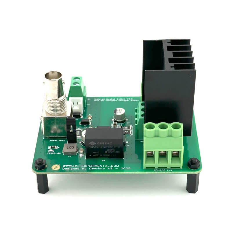 - Isolated Gate Driver: Equipped with an isolated gate driver powered by an onboard DC-DC converter, the control electronics remain electrically independent. This allows the MOSFET to operate at potential differences of up to 2300V relative to the signal source and power supply.