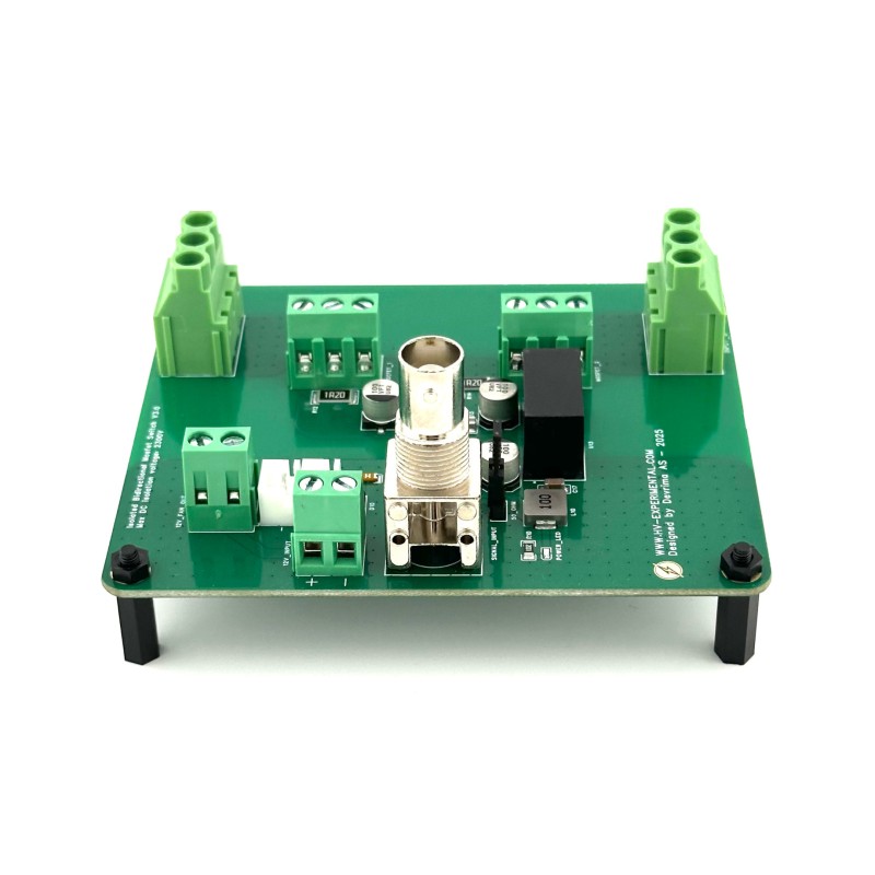 - Robust Isolated Driver System: Like our standard MOSFET Switch Board, this model uses isolated gate drivers powered by an onboard DC-DC converter. This allows the MOSFET pair to operate at up to 2300 V potential difference relative to the control electronics.